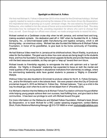 "The value of a man resides in what he gives and not in what he is capable of receiving." – Albert Einstein. The Melbourne and Michael Folkes Foundation is an organization geared towards community development. It will in the near future assist students financially to acquire a better education. Youngsters will benefit by gaining skills that will enable them to be more productive and allow them to become well rounded in life.